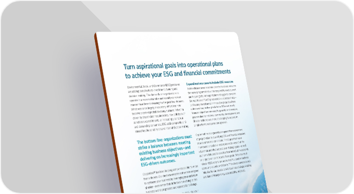 Turn aspirational goals into operational plans to achieve your ESG and financial commitments Environmental, Social, and Governance (ESG) pressures Expand business cases to include ESG measures are adding complexity to investment planning and Bold ambitions need concrete plans to fund and resource decision making. The demands on organizations to the many programs that will be required to meet current operate in a more sustainable and socially-conscious and future goals. Yet organizations struggle to compare manner have been increasing for the past few decades. the multitude of funding requests in a consistent way— What was once largely a voluntary effort has now particularly investments in innovative projects where become a core expectation of any business. Whether outcomes may be less predictable. Whereas purely driven by shareholder requirements, new policies such financial objectives are easy to quantify and measure, as net-zero commitments, or increasingly conscious goals related to net zero, community development, and and demanding consumers, ESG adds complexity and climate resilience are more challenging to express in intensifies the scrutiny around internal decision making. tangible terms everyone can agree on. The bottom line: organizations must Copperleaf helps organizations expand their assessment strike a balance between meeting of project value by quantifying ESG and financial measures existing business objectives—and on a common economic scale. The Copperleaf Value Framework provides an enterprise-wide view of all the delivering on increasingly important value measures that support your strategic goals—as well ESG-driven outcomes. as the models used to calculate how individual investments or projects will contribute to those goals. This ensures all Copperleaf® has been helping companies do this for more relevant ESG criteria are accounted for, used in business than a decade. Our decision analytics software is designed cases, and valued consistently. This drives consensus and to optimize your business by leveraging your definition links day-to-day decisions with business strategy, creating of value—even when that definition is evolving as the a culture of transparency, accountability, and trust. business world progresses and expectations change. So, how can you begin to incorporate ESG into your organization’s decision making to best serve your growing pool of stakeholders?