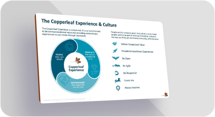 The Copperleaf Experience & Culture The Copperleaf Experience is culture-led. It's our commitment People set this company apart. And culture is what makes to delivering exceptional value and providing extraordinary people want to be part of what we’re building. Culture is experiences to our clients through teamwork. the way we think, act and interact every day, with everyone. Deliver Exceptional Value Provide Extraordinary Experiences Be Open Be Agile Be Respectful Create Joy Always Improve Copperleaf Technologies Inc. © 2022 Proprietary & Confidential I 18